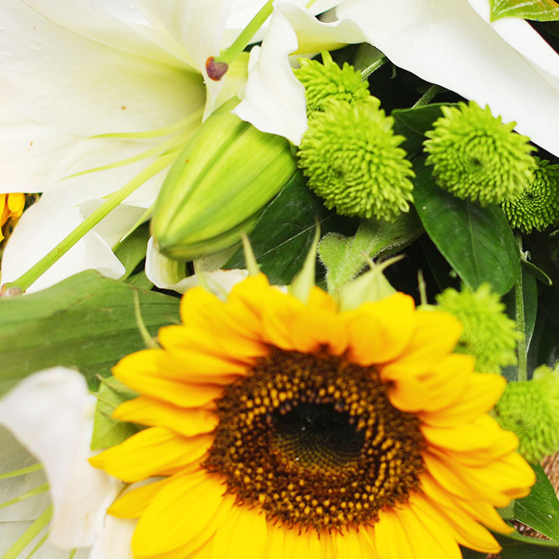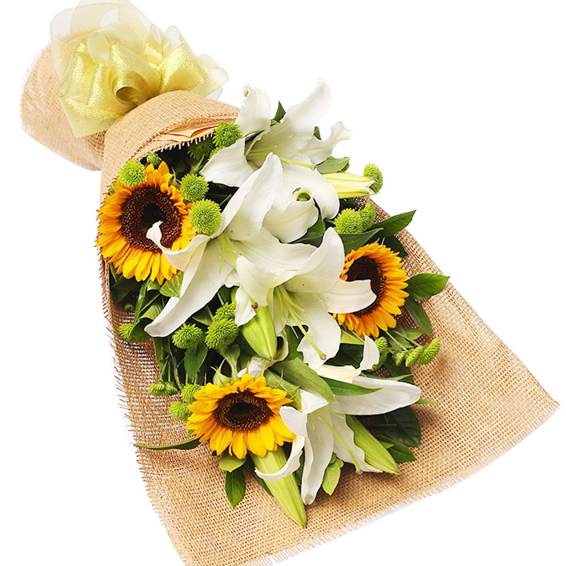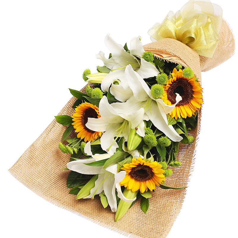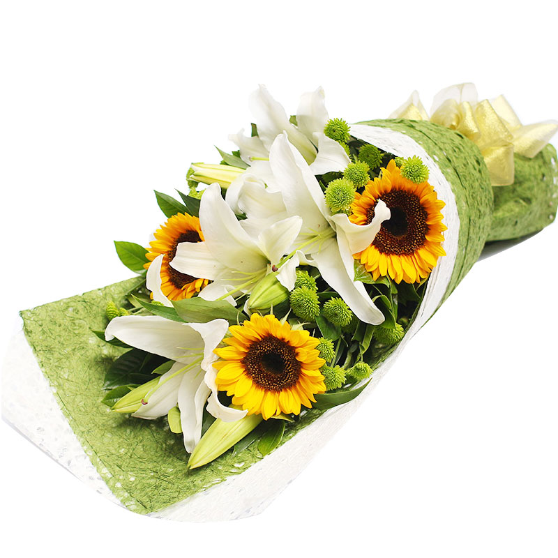 花材: 3朵向日葵,3枝多头白色香水百合,搭配小雏菊、栀子叶。