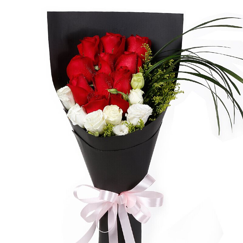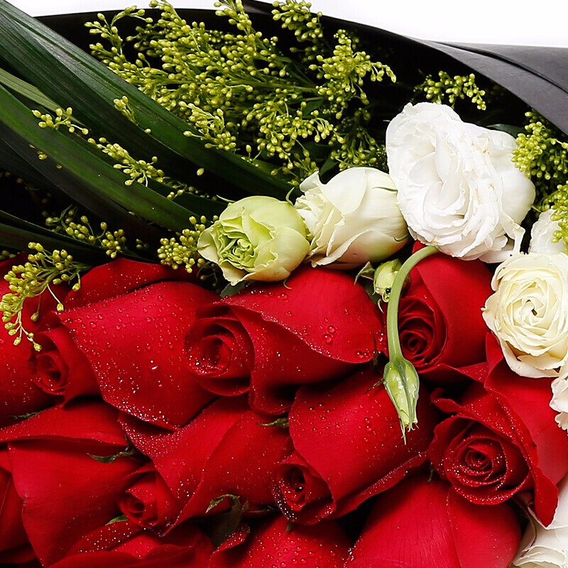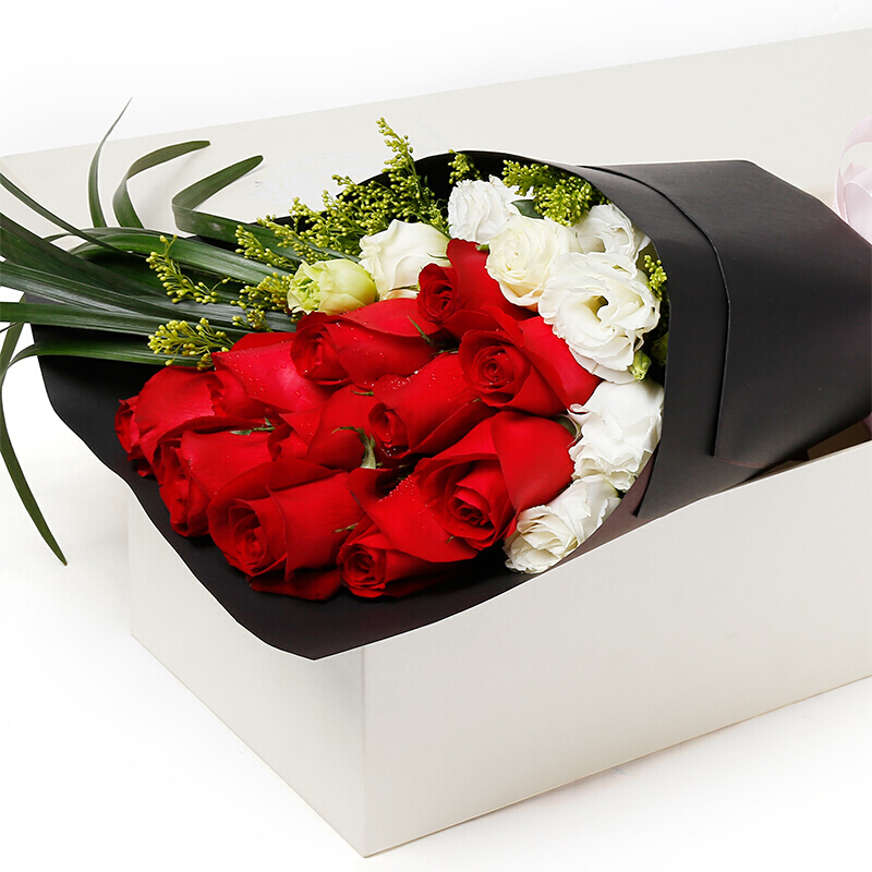 花材: 精选11支红玫瑰,桔梗、书带草、黄莺搭配。
