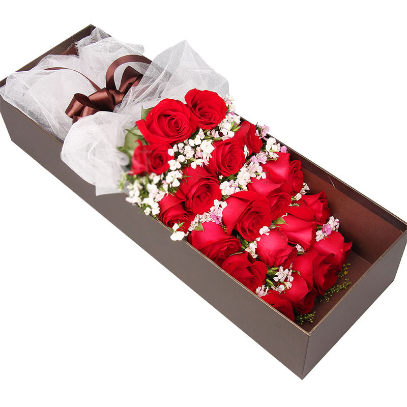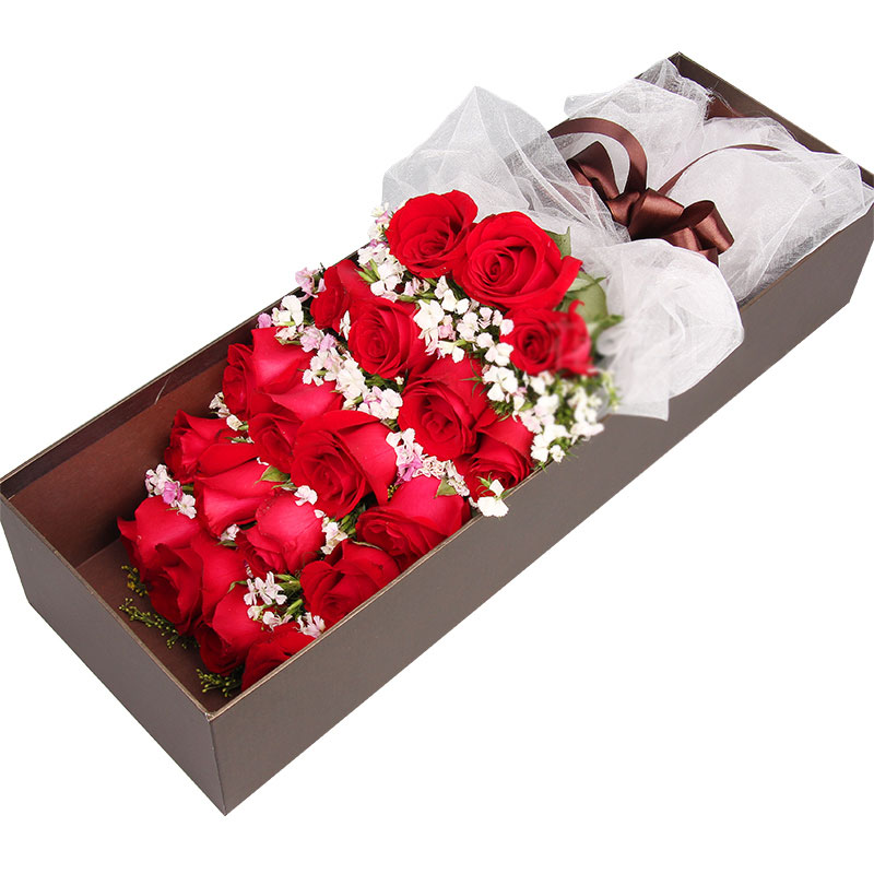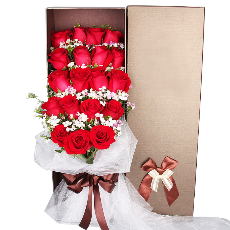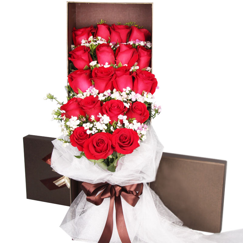 花材: 19朵精品红玫瑰,搭配石竹梅点缀。