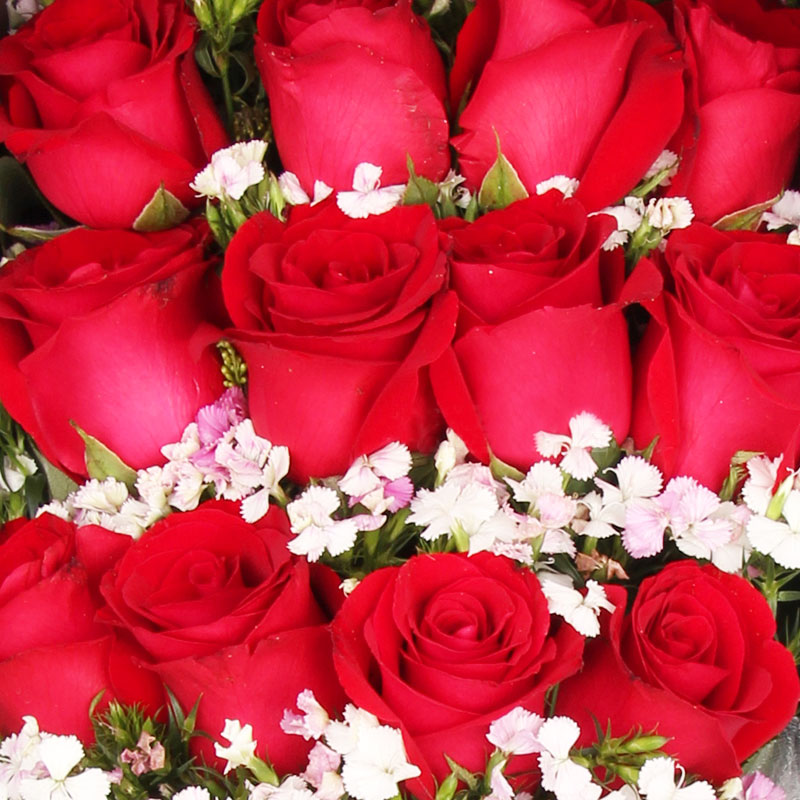 花 材:19朵精品红玫瑰,搭配石竹梅点缀。