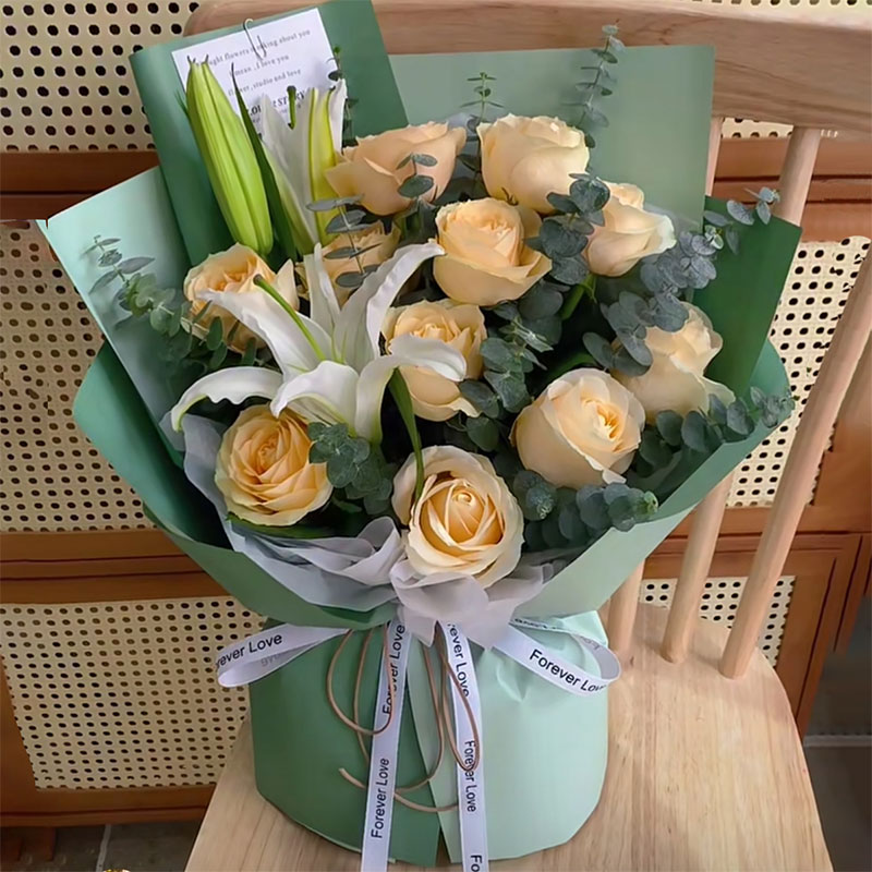 花材: 11朵香槟玫瑰,1支白色多头香水百合,搭配尤加利叶间插。
