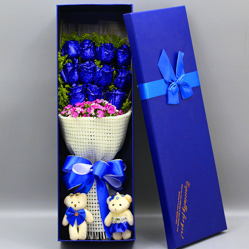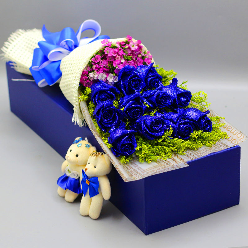 花材: 11枝蓝色妖姬,一对情侣小熊,搭配相思梅、黄莺点缀。