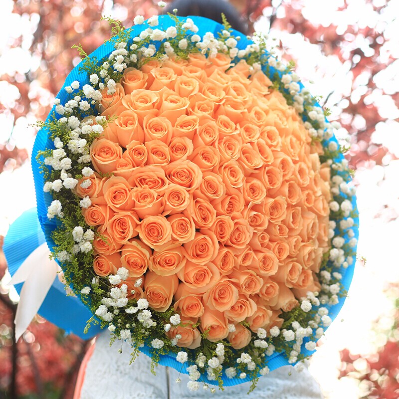 花 材:精选99朵香槟玫瑰,满天星外围点缀。
