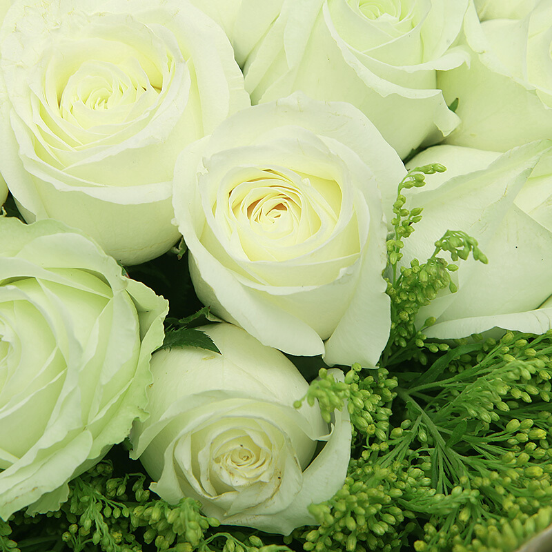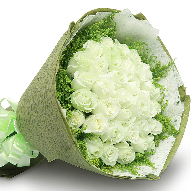 花 材:33朵精品白玫瑰,搭配黄莺围绕装饰。