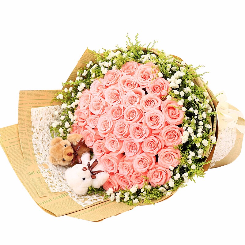 花材: 33朵戴安娜(顶级)玫瑰,2只小熊,满天星围绕点缀。