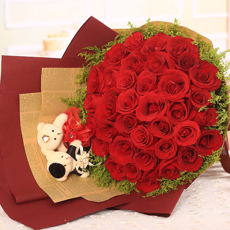 花 材:33支精品红玫瑰,2只可爱小熊,搭配黄莺外围点缀。