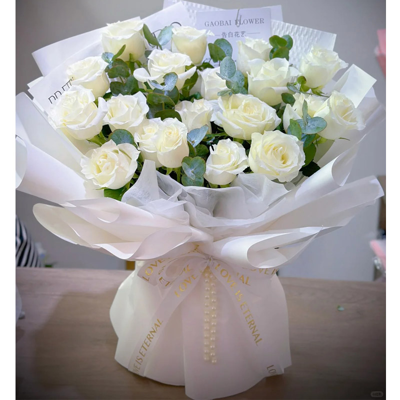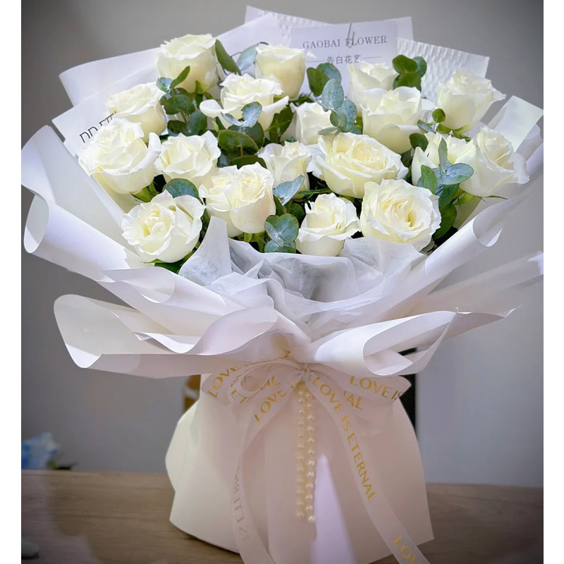 花 材:19朵精品白玫瑰,搭配尤加利叶装饰。