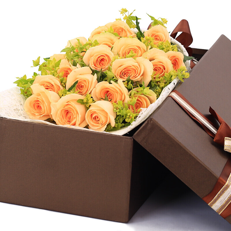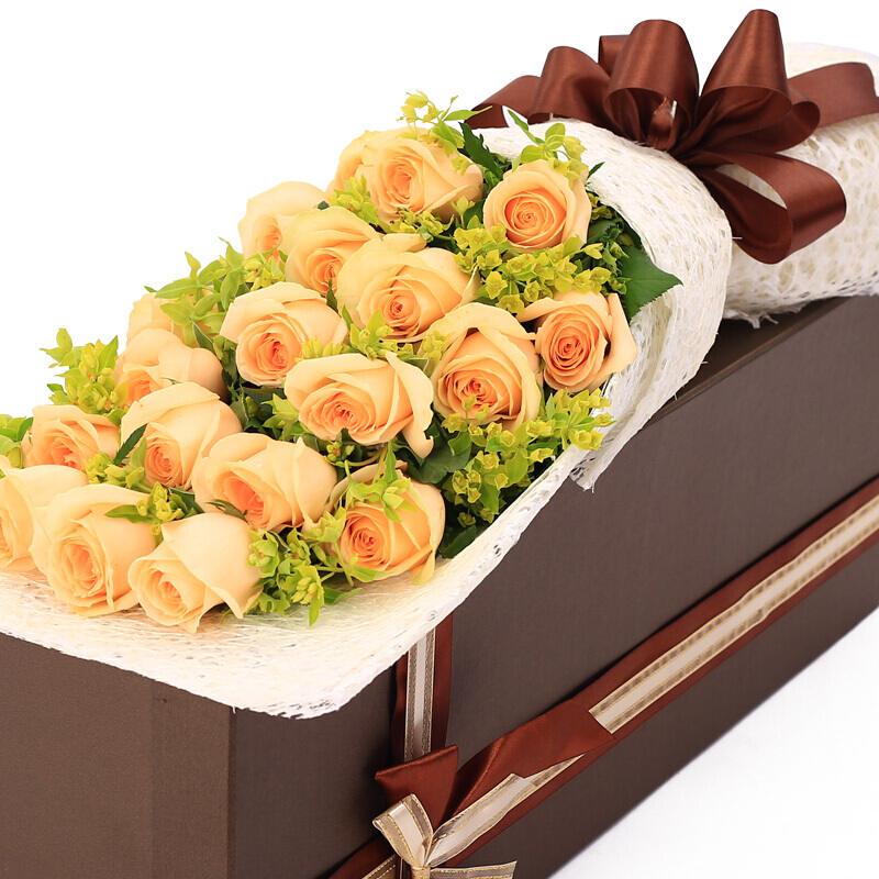 花 材:精选19朵香槟玫瑰,搭配叶上黄金点缀。