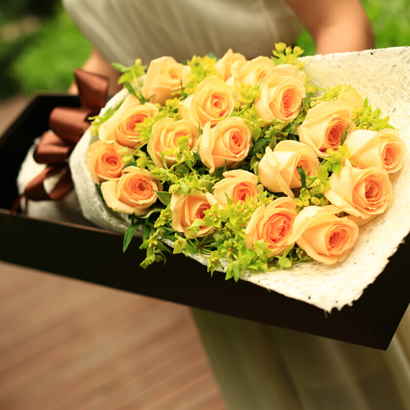 花材: 精选19朵香槟玫瑰,搭配叶上黄金点缀。