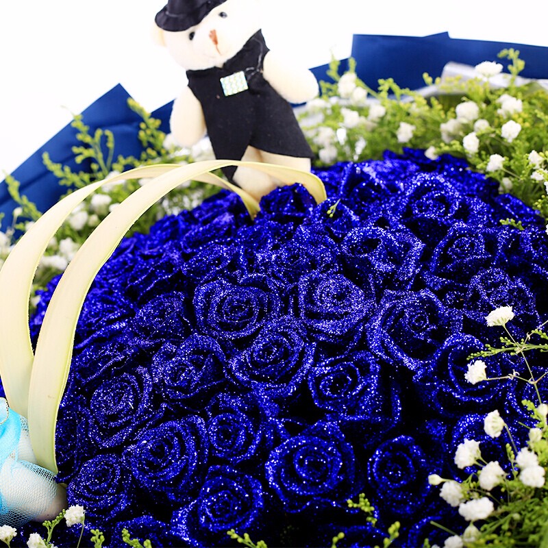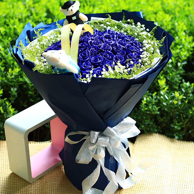花材: 精心挑选33枝顶级蓝色妖姬,2只可爱公仔,黄莺,满天星外围点缀.