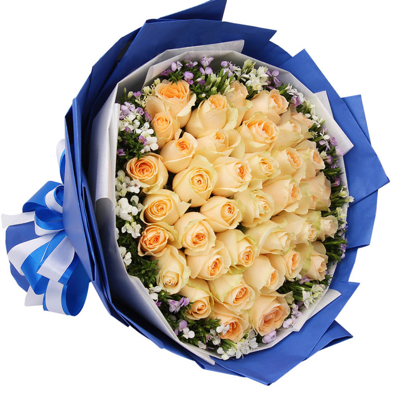 花 材:33朵精品香槟玫瑰,搭配相思梅外围丰满点缀。