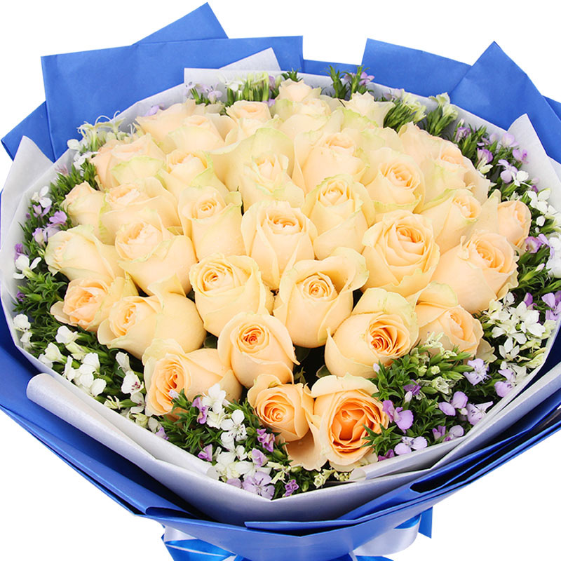 花材: 33朵精品香槟玫瑰,搭配相思梅外围丰满点缀。