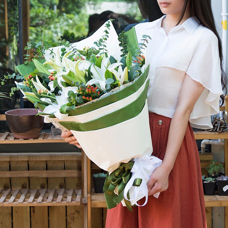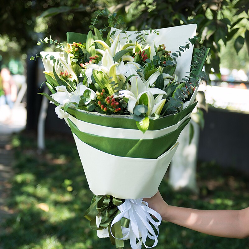 包 装:绿色、白色平面纸扇形包装,绿色、白色丝带系法式蝴蝶结。