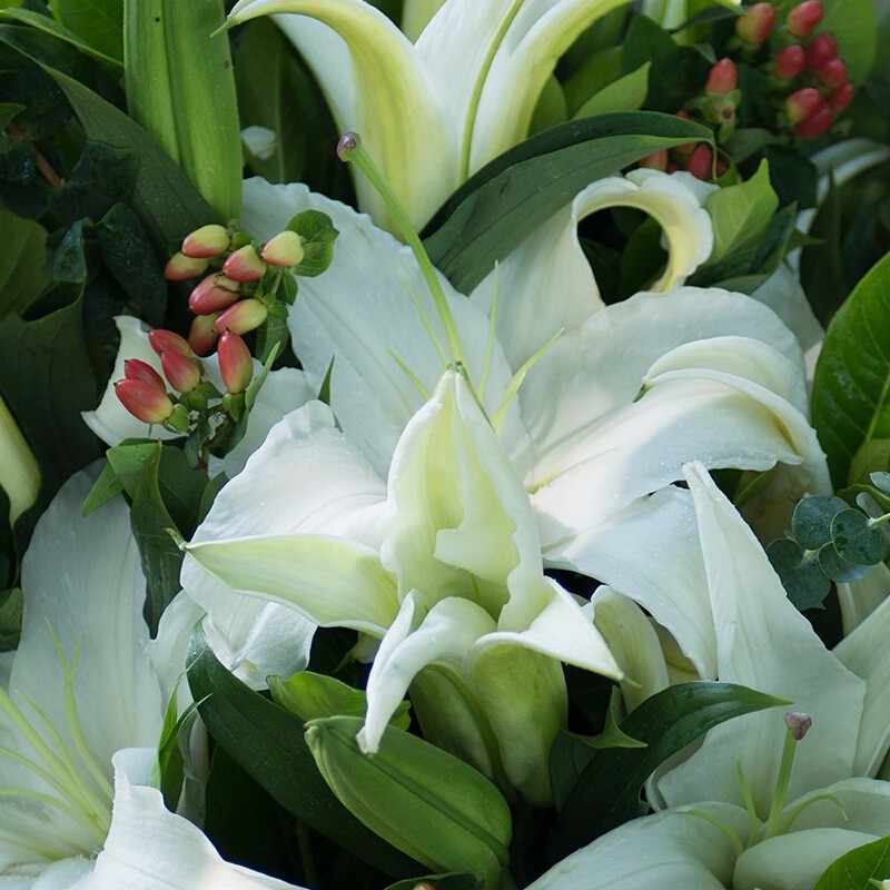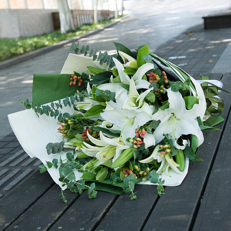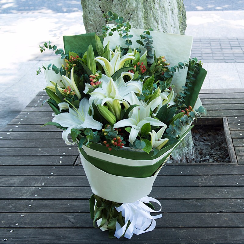 花 材:精选6支多头百合,红豆、尤加利叶、绿叶丰满间插。