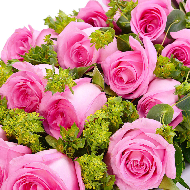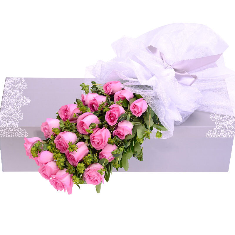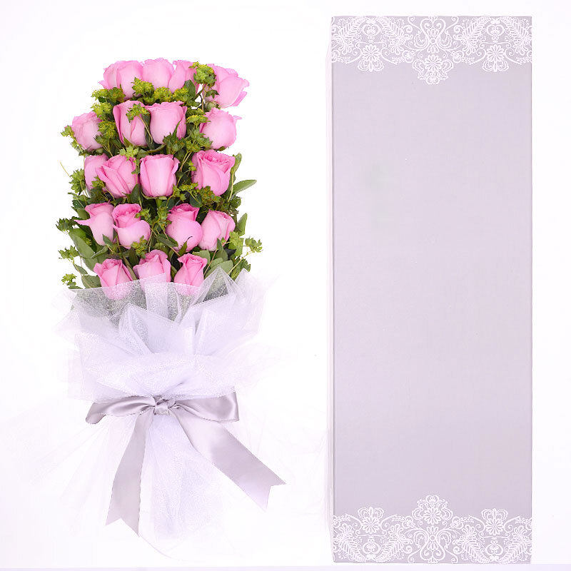 花材: 19枝精品粉玫瑰,搭配叶上金、绿叶。