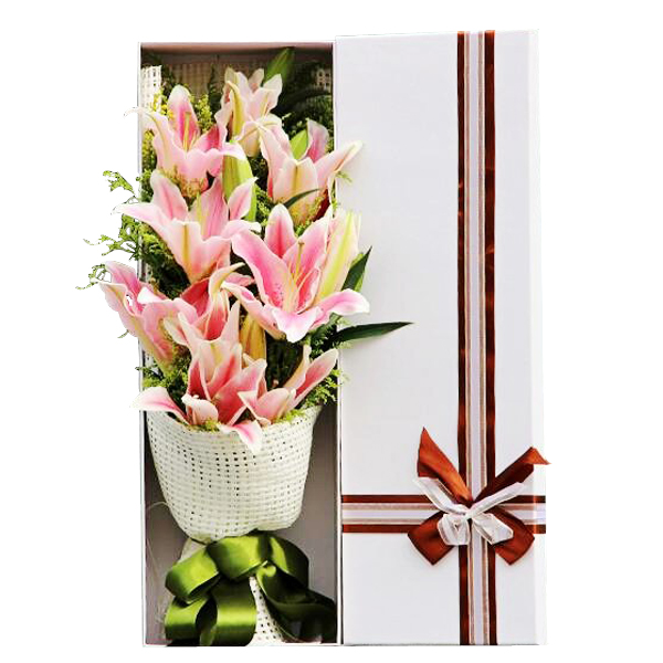 花材: 精选12朵粉百合,黄莺间插点缀。