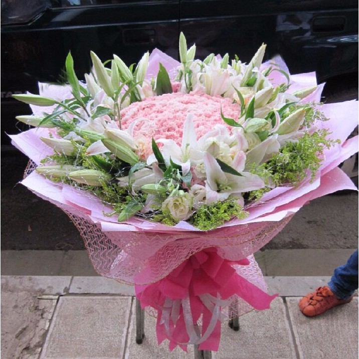 花 材:精选99支粉色康乃馨,21支多头香水百合环绕,黄莺、银丝外围点缀。