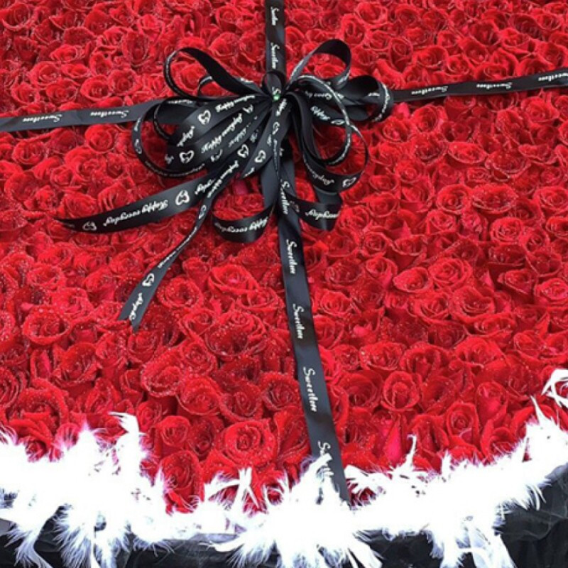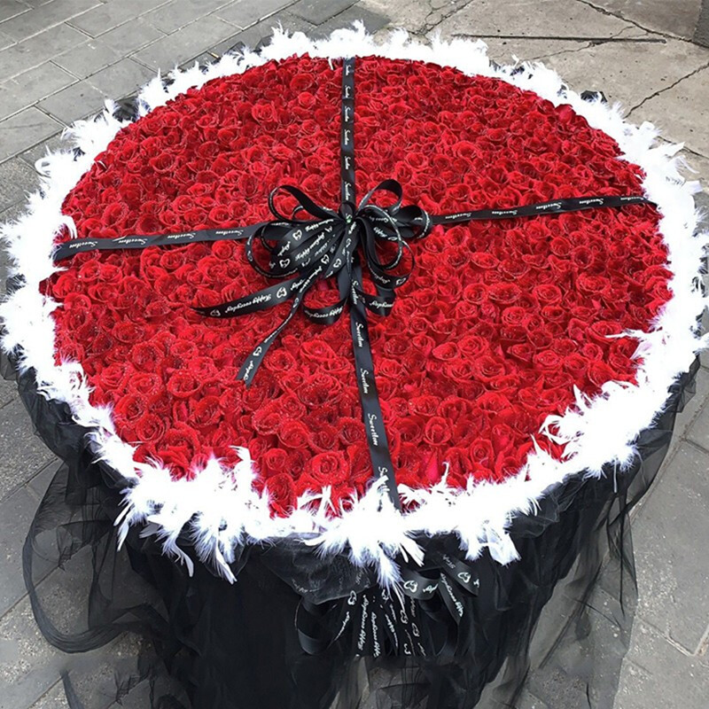花 材:精选999朵红玫瑰,外围进口白色羽毛装饰,黑色英文缎带十字礼物花结。