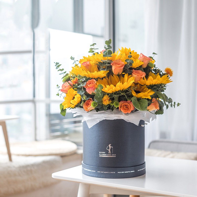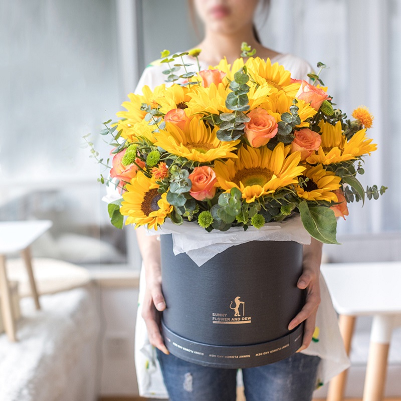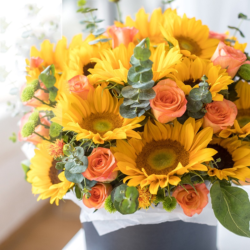 花材: 12朵向日葵,11朵金辉玫瑰(或香槟玫瑰),小雏菊,尤加利叶等搭配