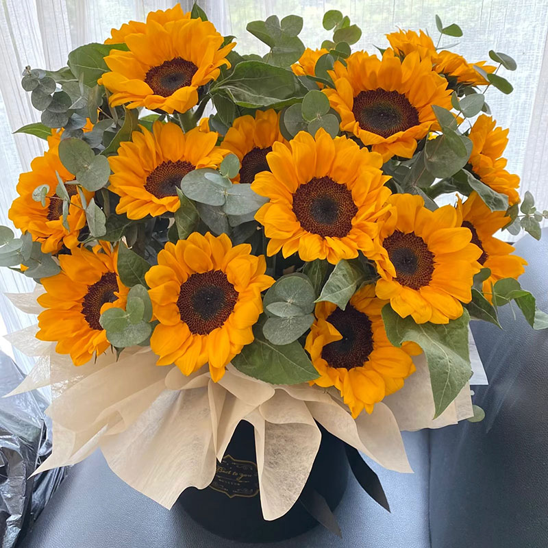 花 材:19朵精品向日葵,搭配尤加利叶等绿叶装饰。