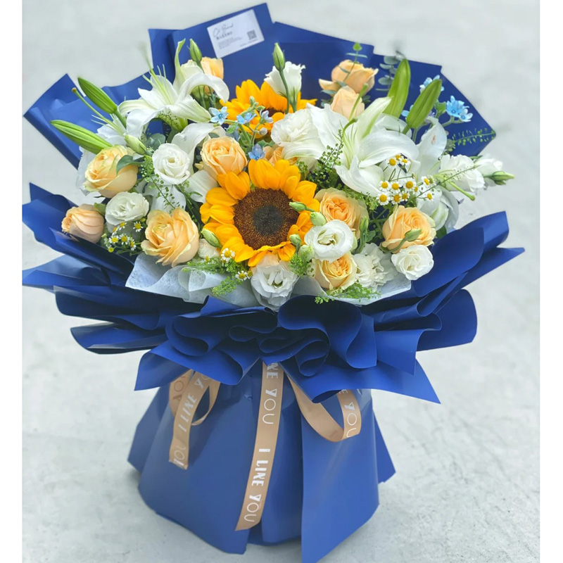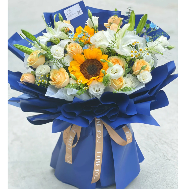 花 材:2朵向日葵,11朵香槟玫瑰,3支白色多头香水百合,搭配6支洋桔梗(断货则用同数量白玫瑰代替),洋甘菊,尤加利叶装饰。