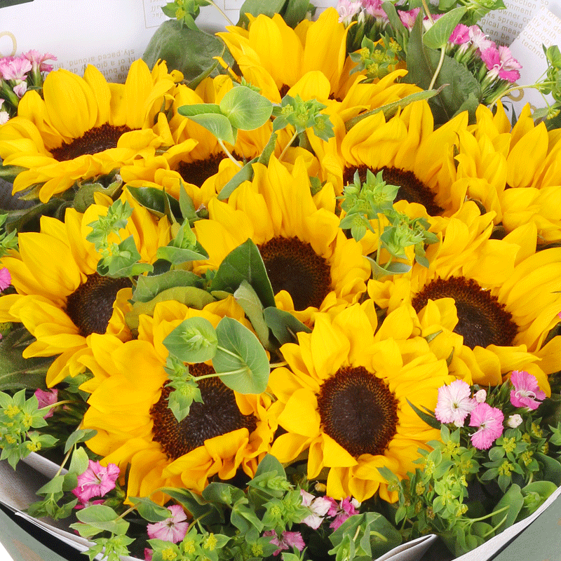 花材: 11朵精品向日葵,搭配叶上黄金、绿叶、石竹梅点缀。