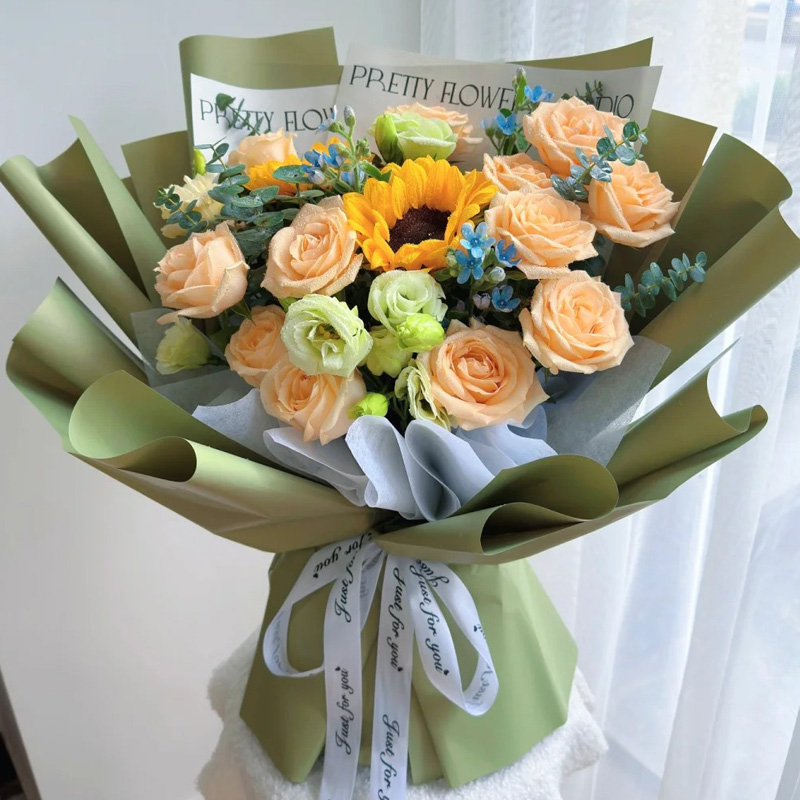 花 材:2支向日葵,11朵香槟玫瑰,搭配4支洋桔梗,尤加利叶装饰。