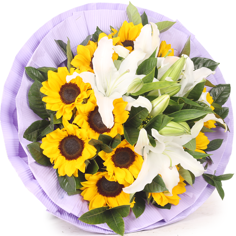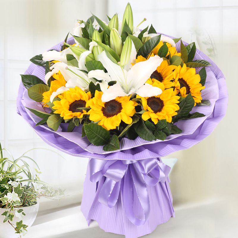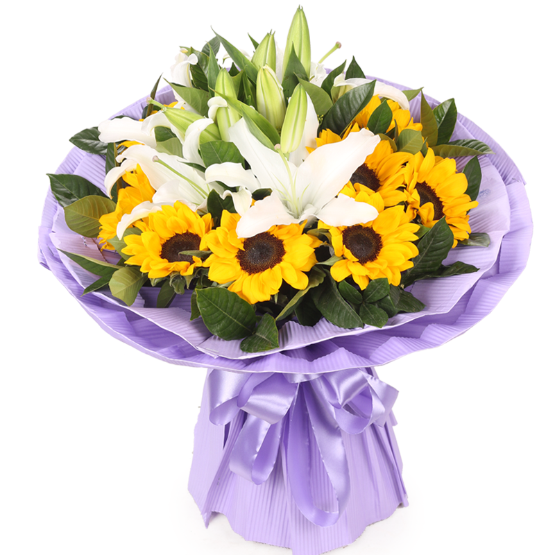 花 材:11支精品向日葵,3支多头白色香水百合,栀子叶点缀。