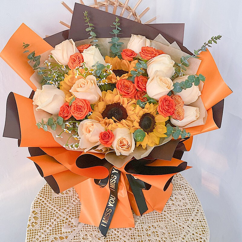 花 材:4支向日葵,11朵香槟玫瑰,5支多头橙色小玫瑰,搭配尤加利叶装饰。