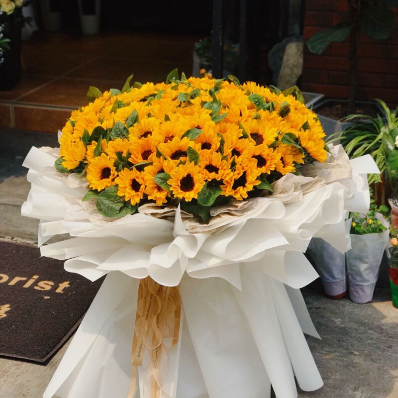 花 材:精选99朵向日葵,香槟色波点纸多层内衬,白色雾面纸多层外包,香槟色花结。