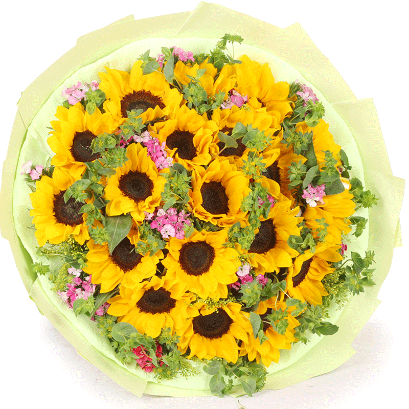 花材: 19朵精品向日葵,搭配叶上黄金、石竹梅点缀。