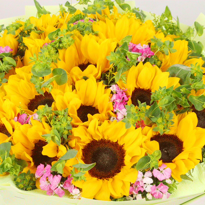 花 材:19朵精品向日葵,搭配叶上黄金、石竹梅点缀。
