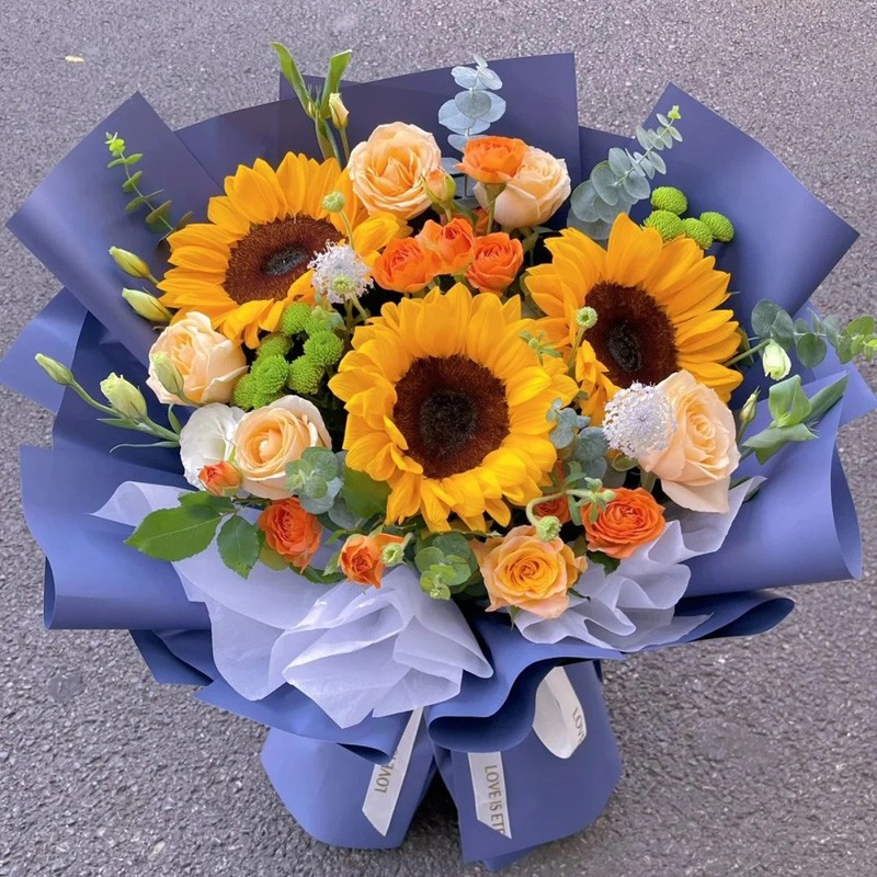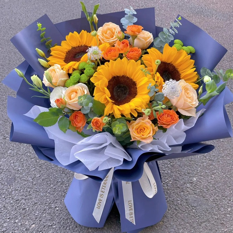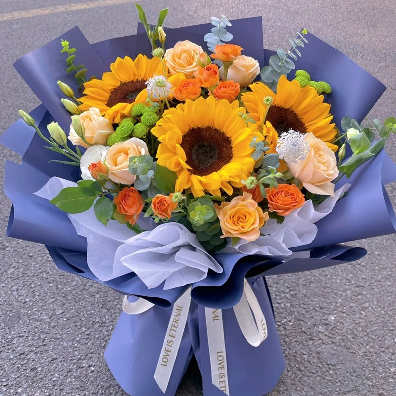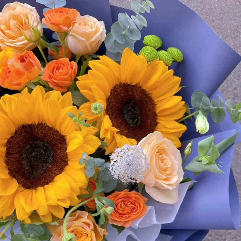 花 材:3朵向日葵,9朵香槟玫瑰,搭配3支多头橙色小玫瑰,尤加利叶装饰。