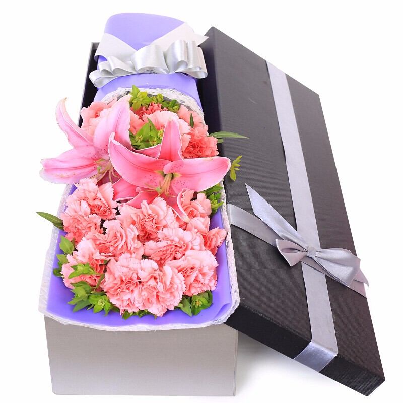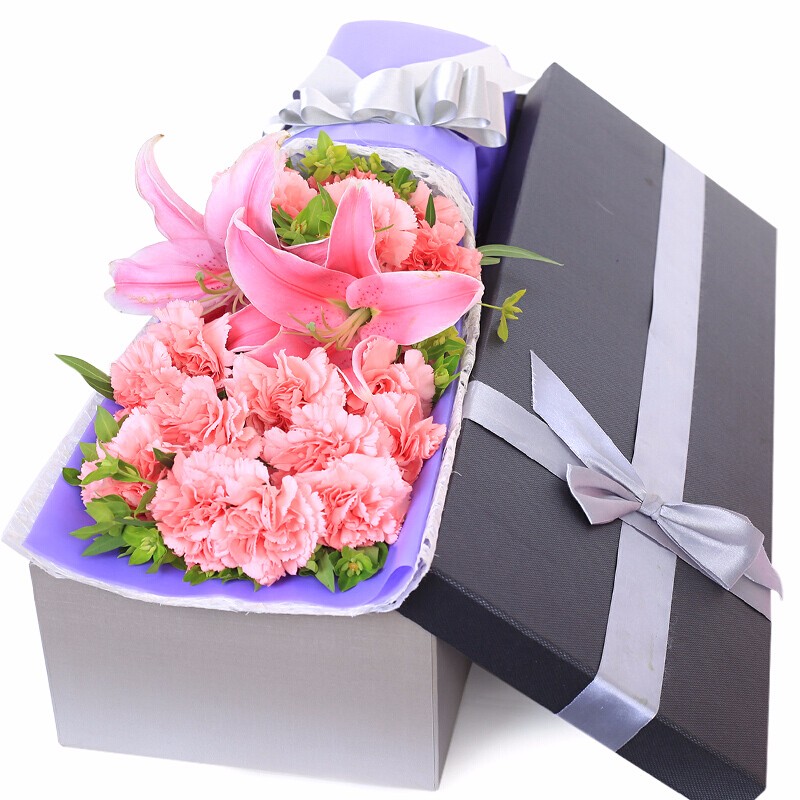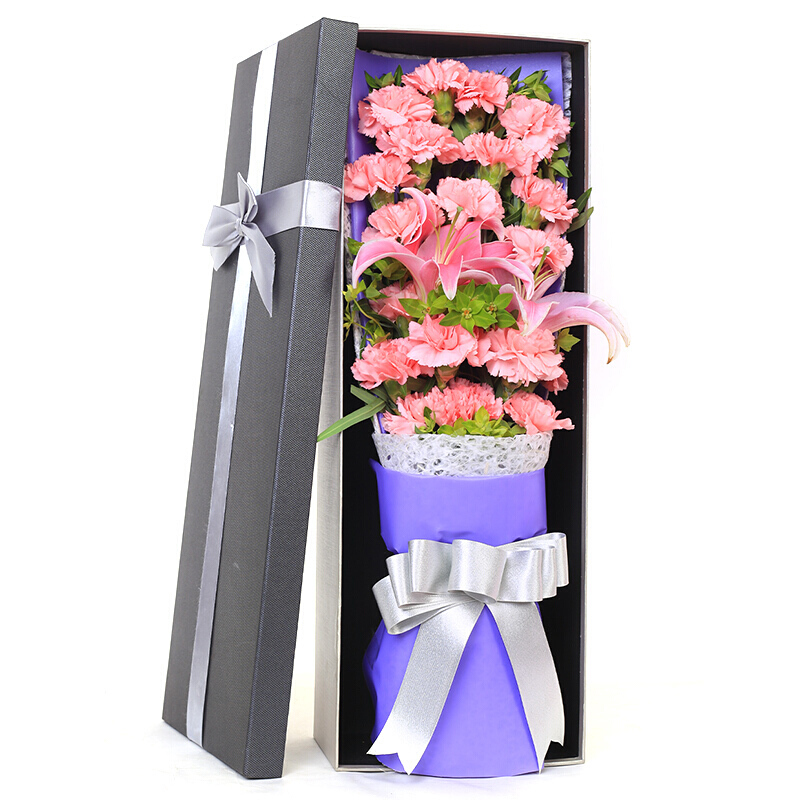 花 材:精选19朵粉色康乃馨,1支多头粉百合,搭配叶上黄金、丝带草装饰。