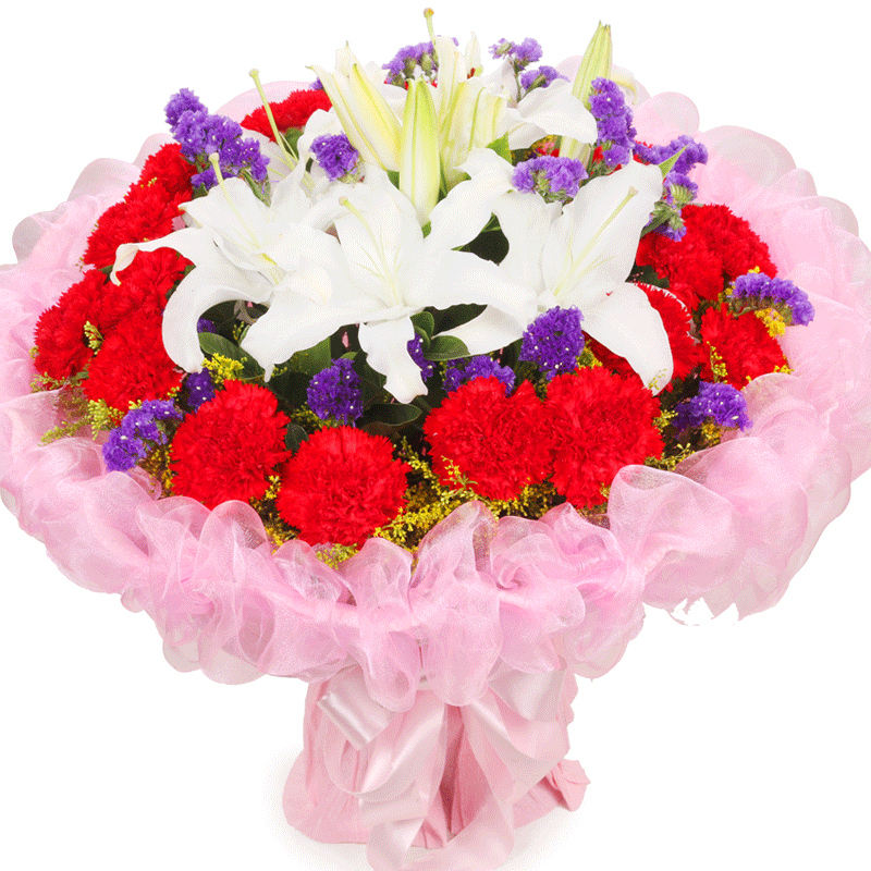 花材: 19支红色康乃馨,3支多头香水百合,搭配黄莺、勿忘我装饰。
