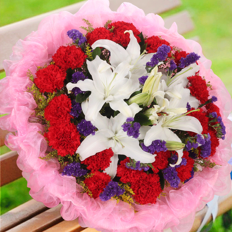 花 材:19支红色康乃馨,3支多头香水百合,搭配黄莺、勿忘我装饰。