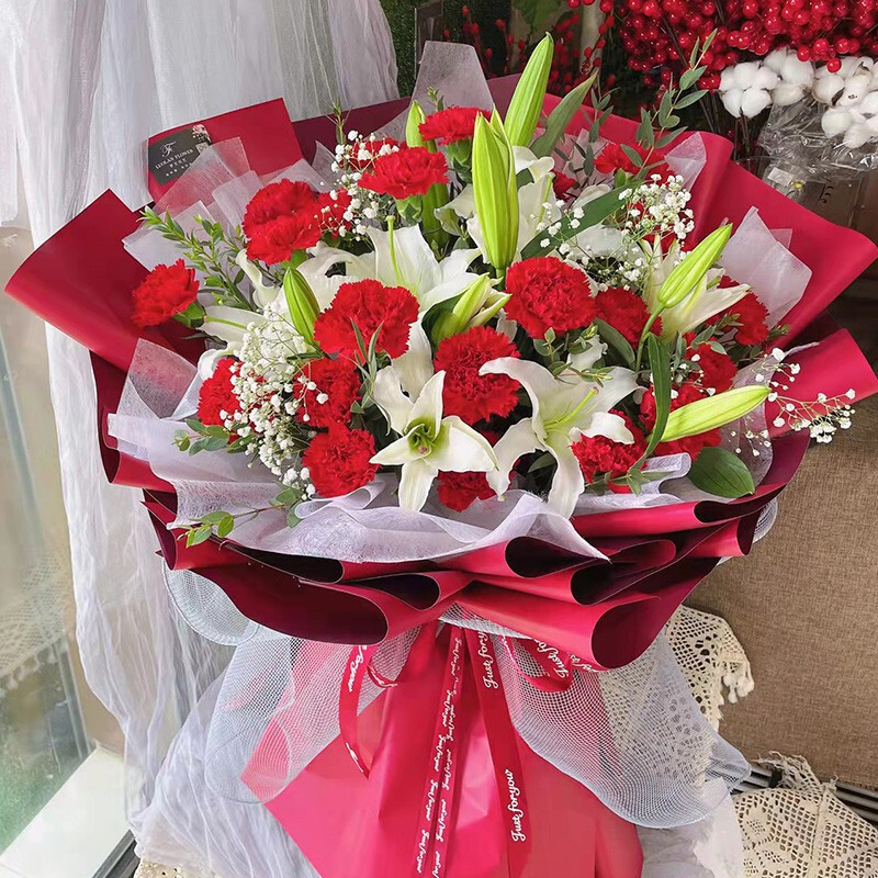 花材: 19朵红色康乃馨,4支多头香水白百合,满天星、尤加利叶装饰。
