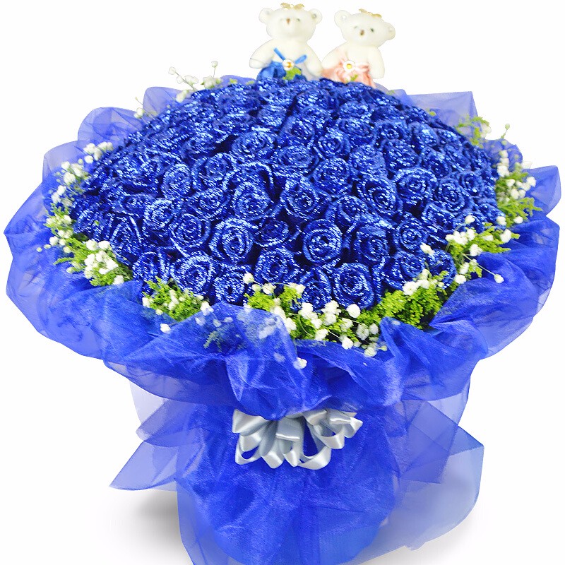 花材: 66朵顶级蓝玫瑰,2只可爱小熊,满天星、黄莺环绕。