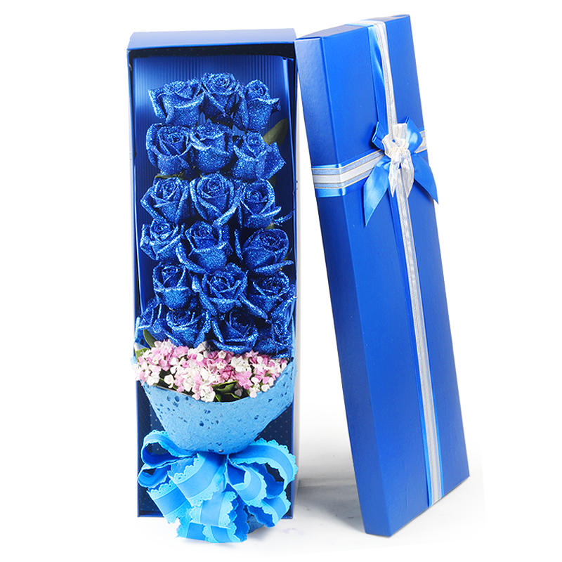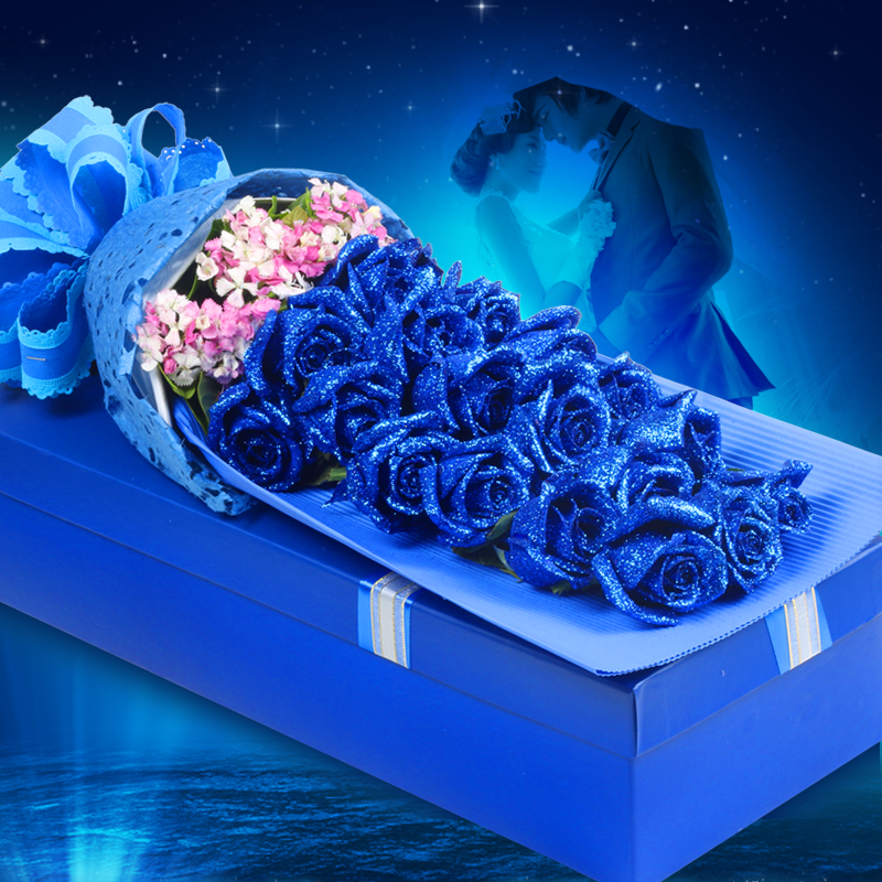 花材: 19朵精品蓝色妖姬,搭配石竹梅装饰。