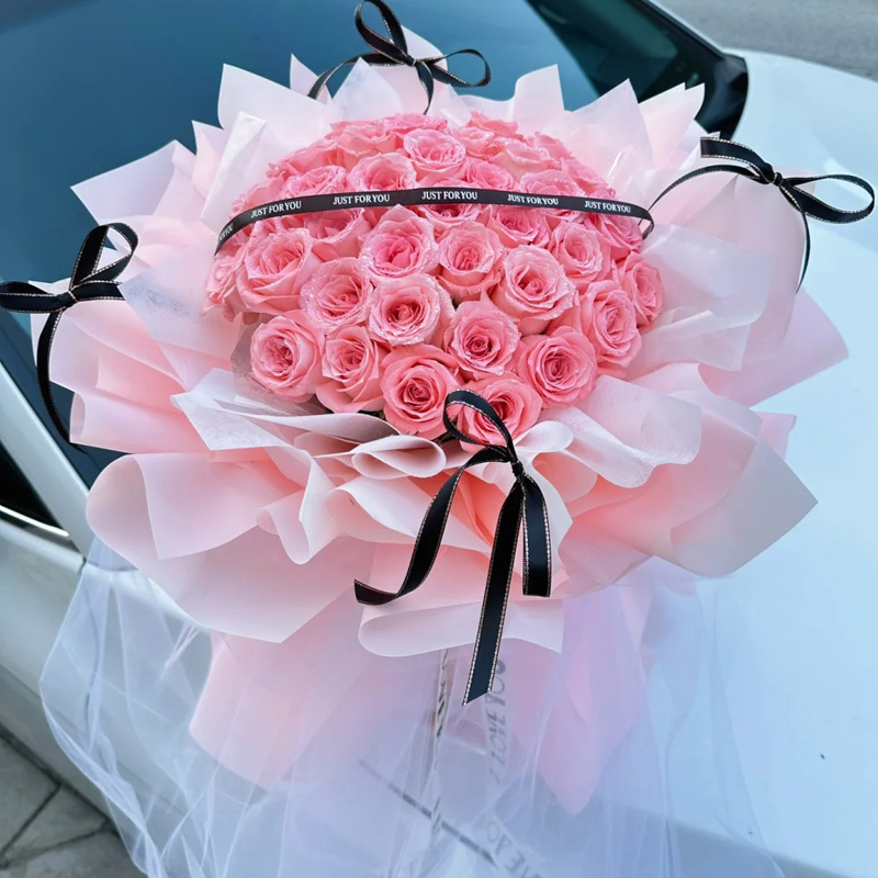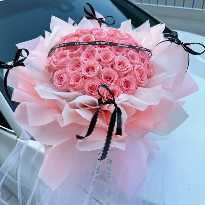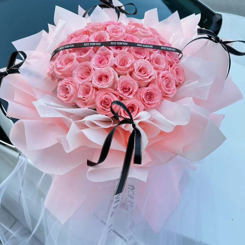 花 材:33朵粉玫瑰,搭配黑色英文缎带装饰花面。