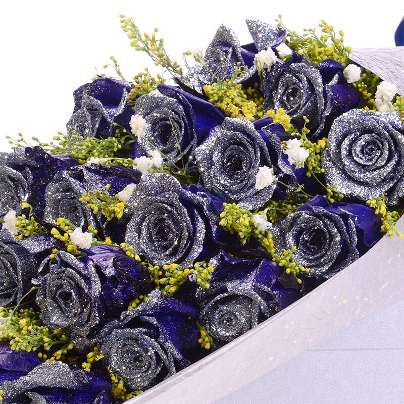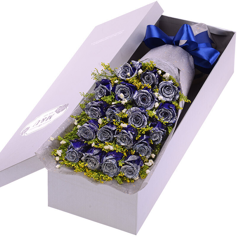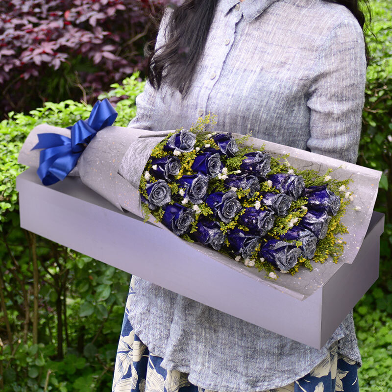 花材: 19朵精品蓝色妖姬,搭配满天星、黄莺装饰。