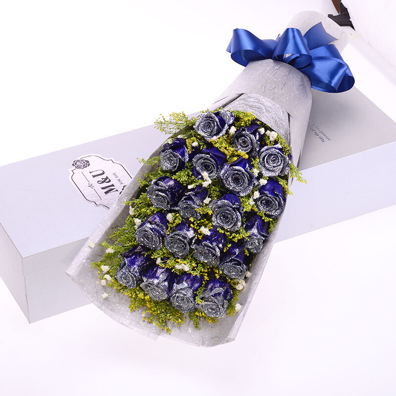 包装: 银丝纸内衬,银色印花纸束扎,宝蓝色蝴蝶结,银色精美礼盒装。