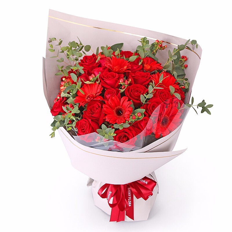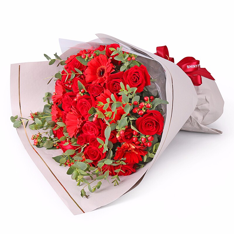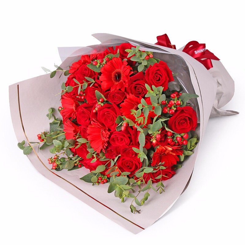 花材: 精选33朵红玫瑰,6支红色太阳花,火龙珠、尤加利尖叶装饰。