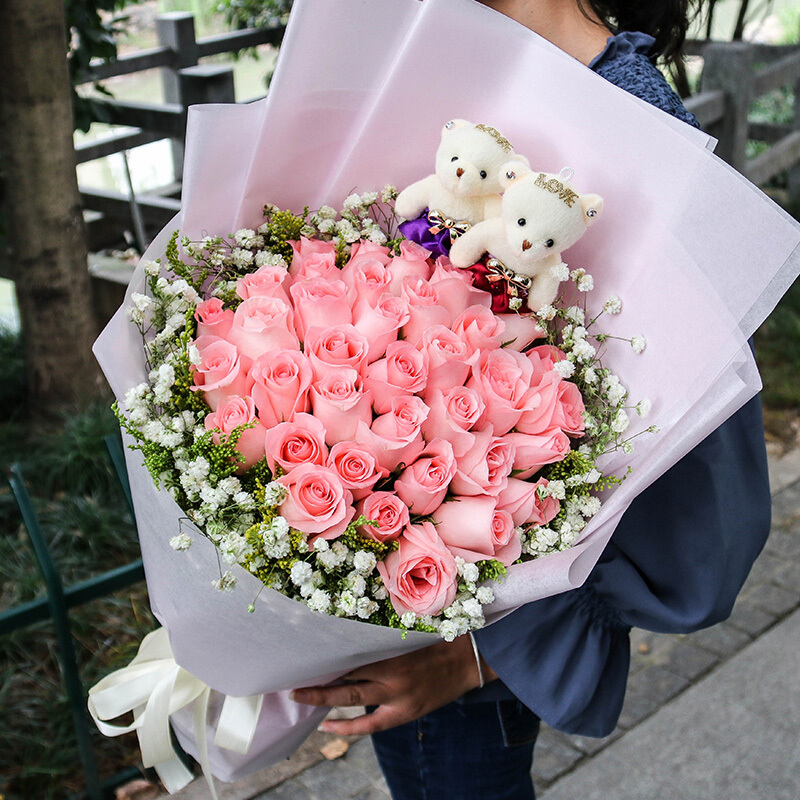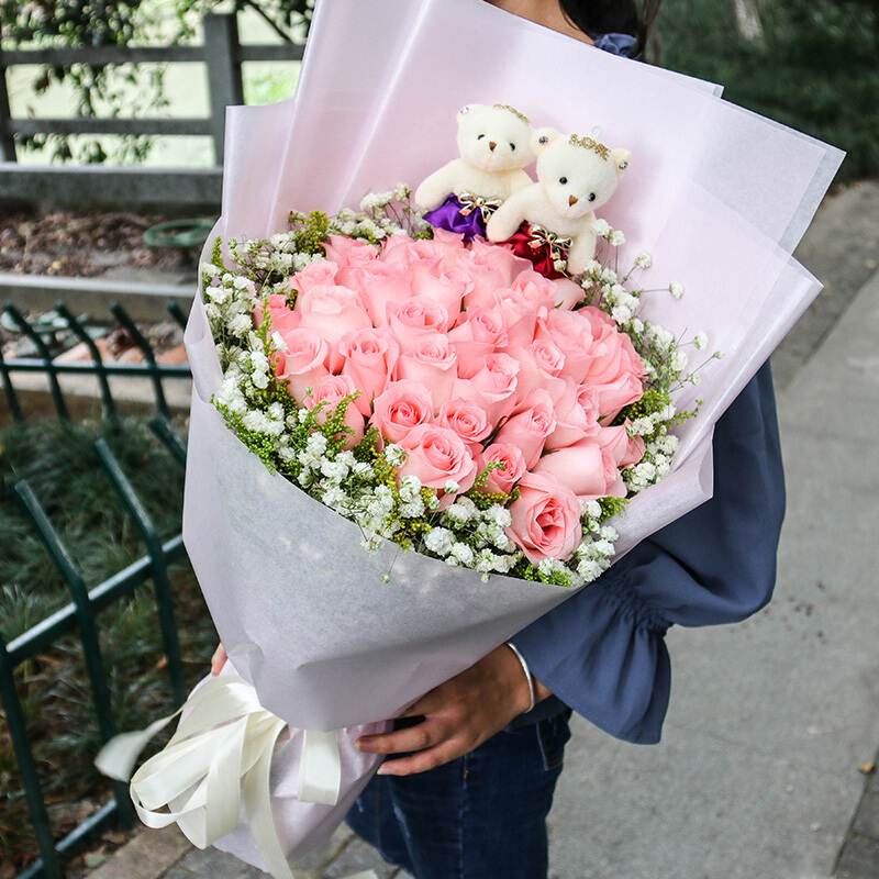 花 材:33朵精品粉玫瑰,2只可爱公仔,黄莺、满天星外围丰满环绕。