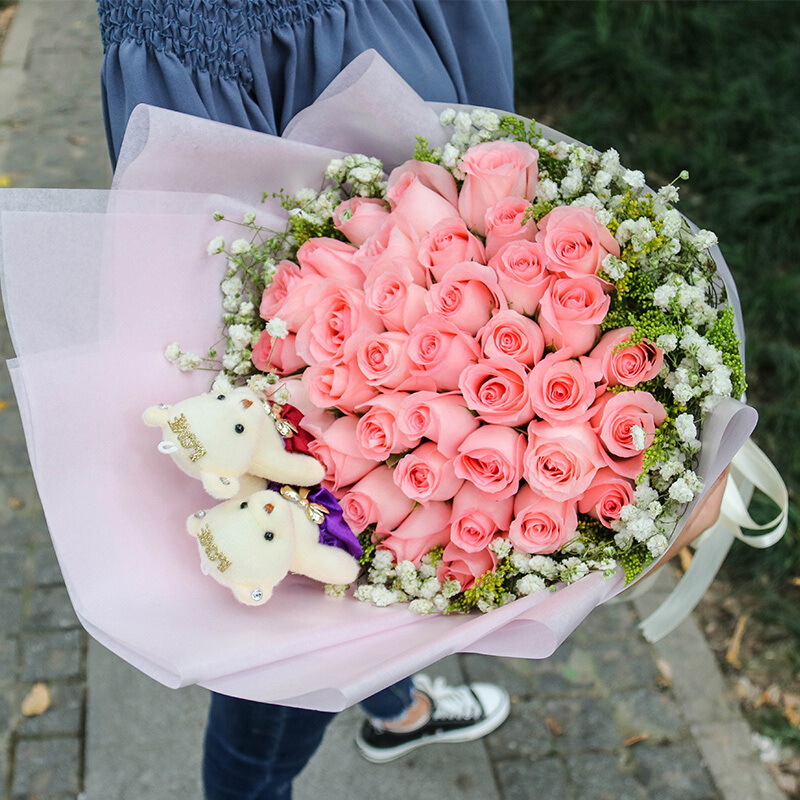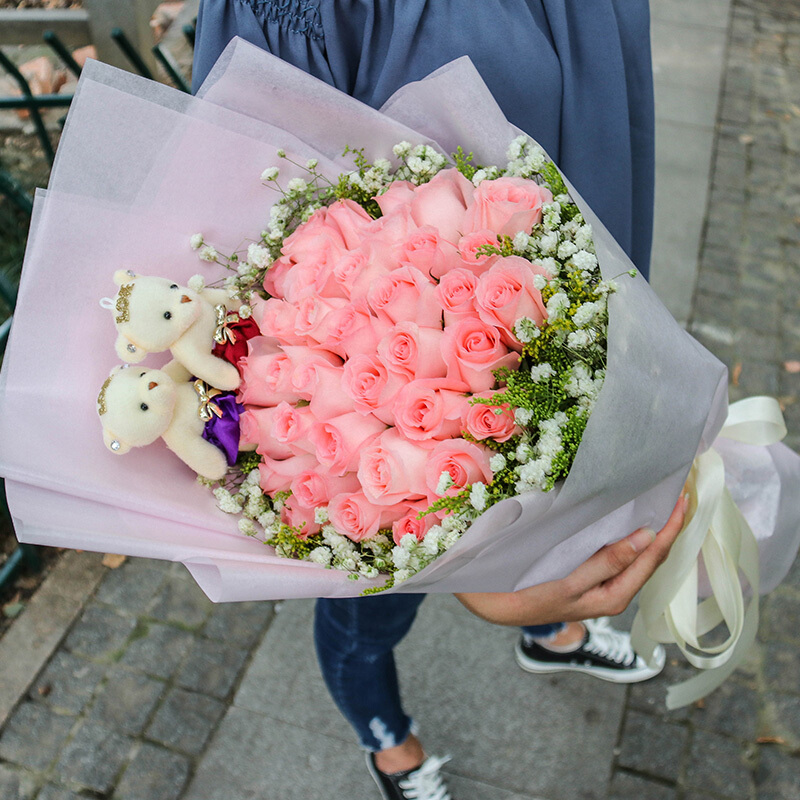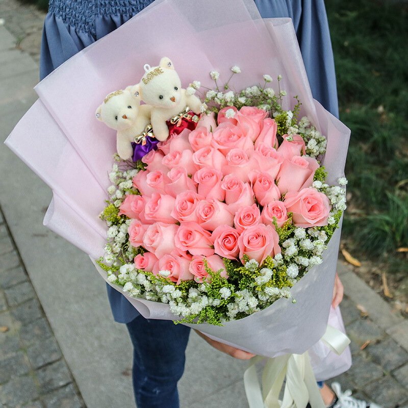 花材: 33朵精品粉玫瑰,2只可爱公仔,黄莺、满天星外围丰满环绕。
