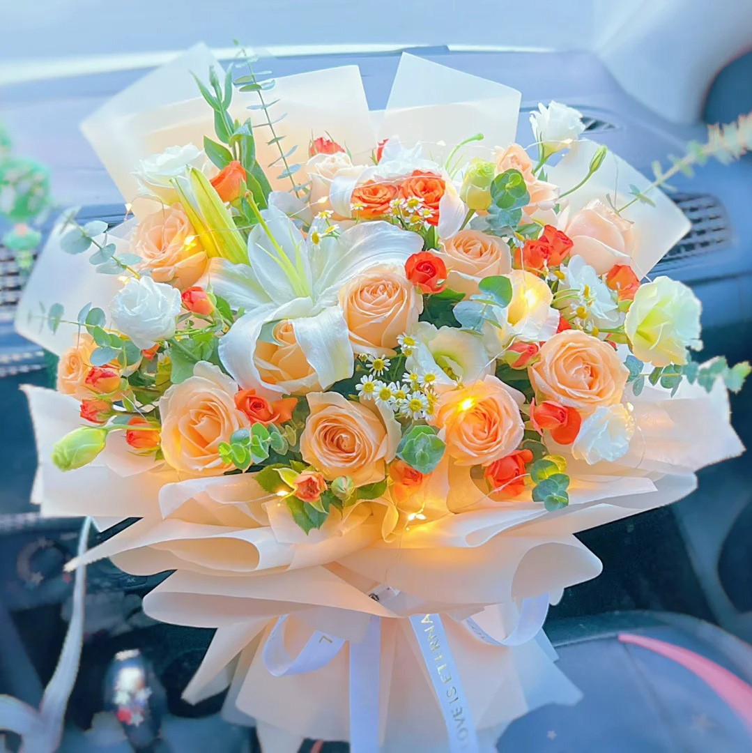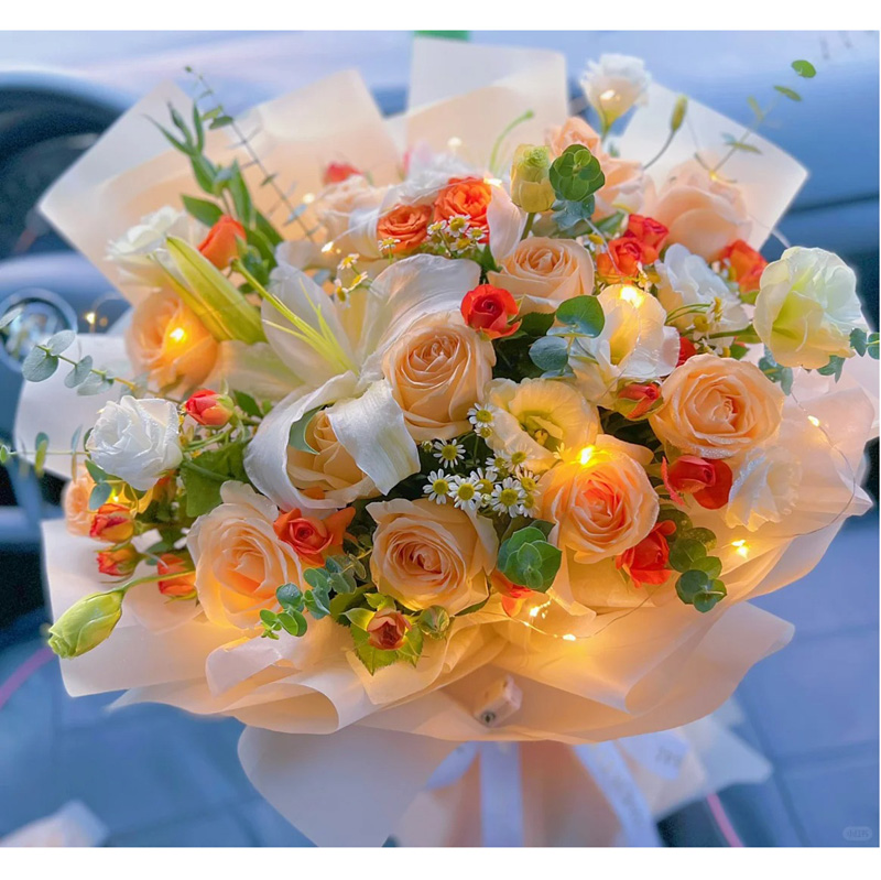 花 材:12朵香槟玫瑰,1条灯串,1支白色多头百合,8支橙色多头小玫瑰,6支洋桔梗(断货则用同数量白玫瑰代替),搭配洋甘菊、尤加利叶装饰。