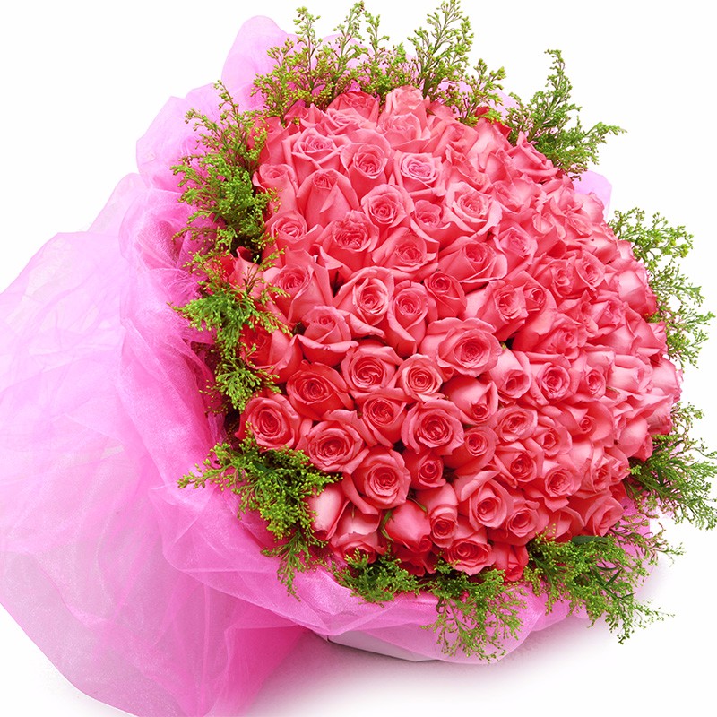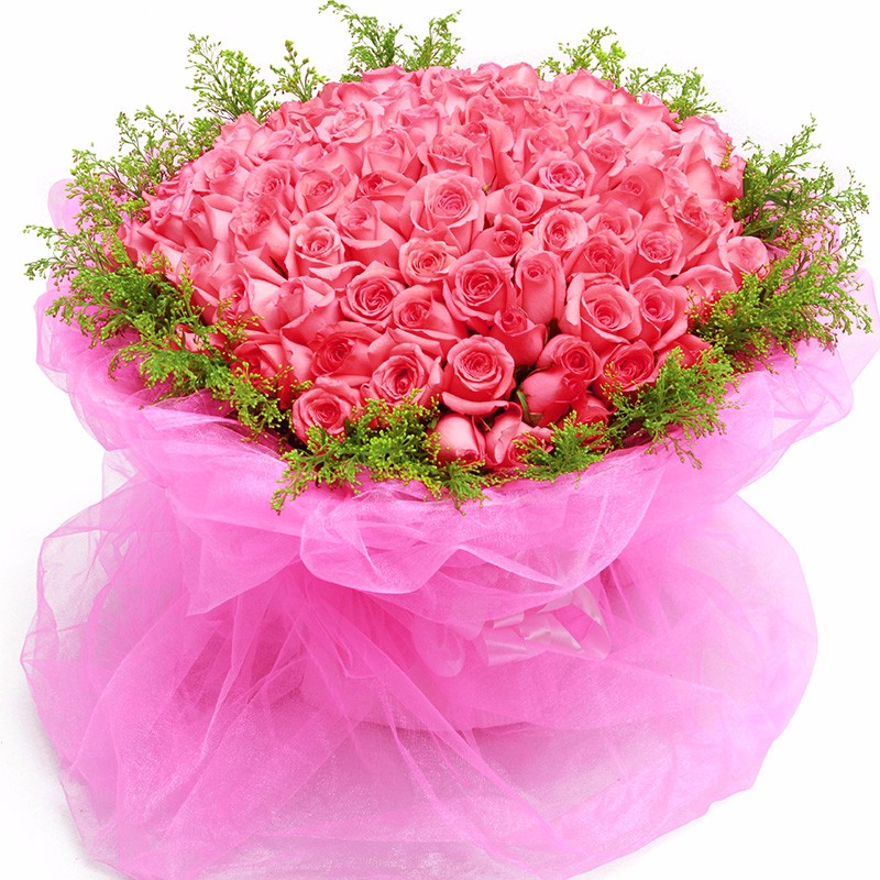花材: 66支精品粉玫瑰,搭配黄莺草外围环绕。
