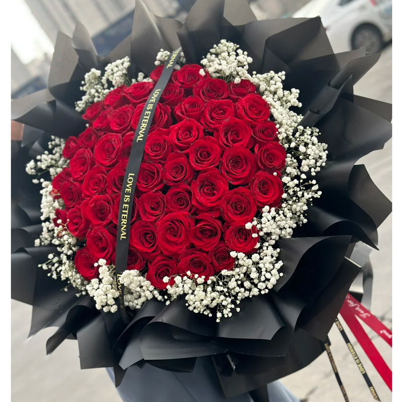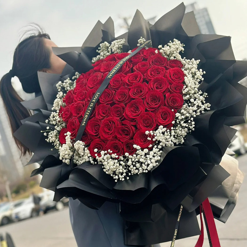 花 材:52朵红玫瑰,1条缎带装饰花面,满天星环绕。
