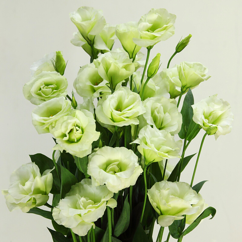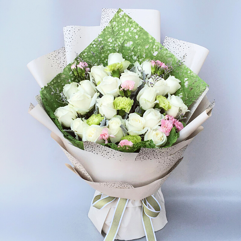 包 装:绿色落水纸内衬,白色硬纸多层包扎成扇形花束,同色系典雅蝴蝶结。