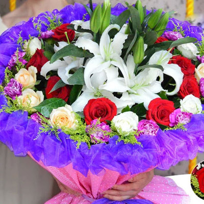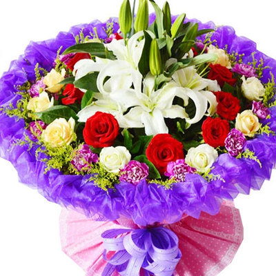 花材: 32朵精品玫瑰康乃馨混搭(10朵红玫瑰+10朵香槟玫瑰+12朵康乃馨),4支多头百合,黄莺、栀子叶装饰。